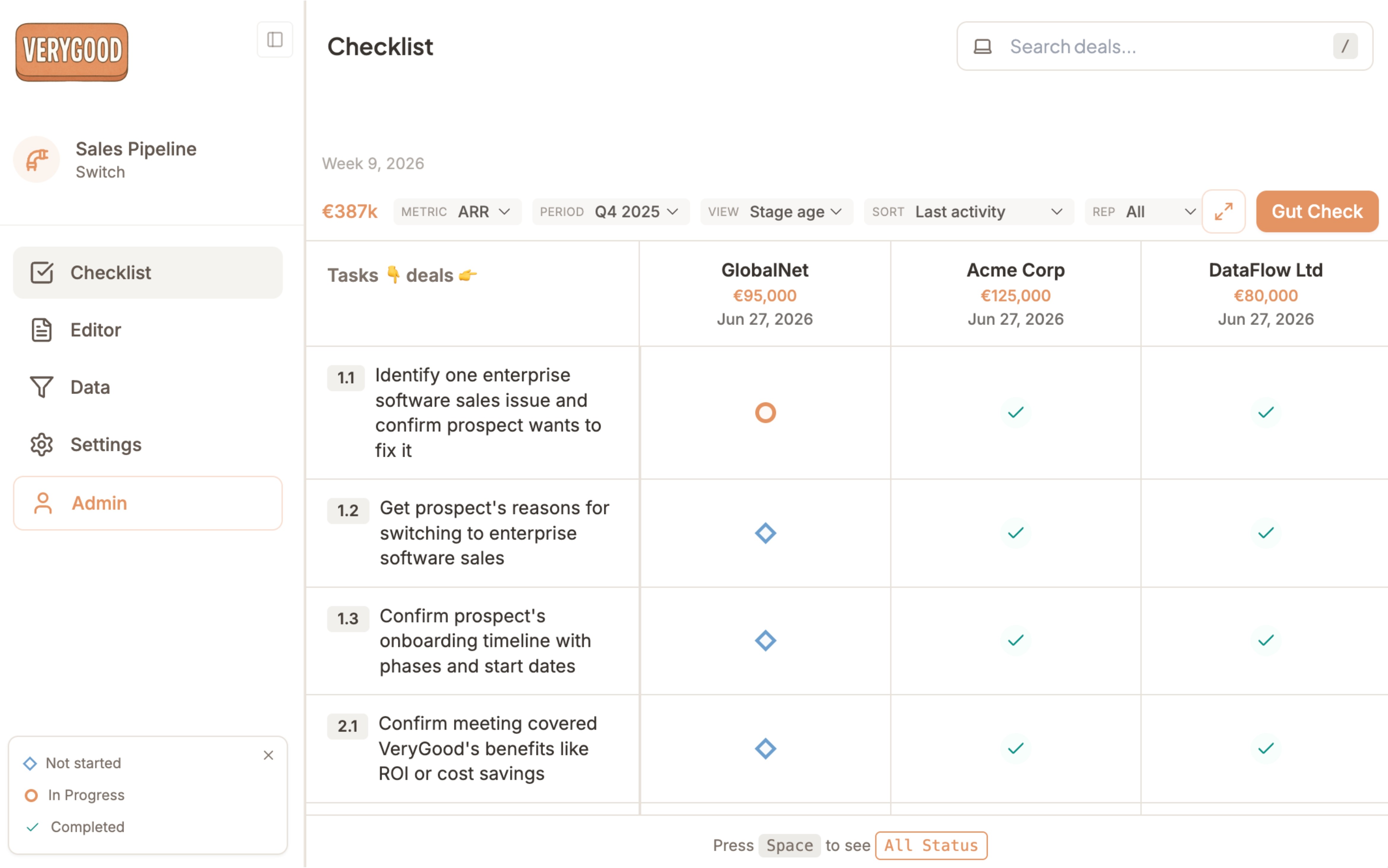 VeryGood helps you gain visibility with a live-updated checklist of tasks that took place on each of your deals.